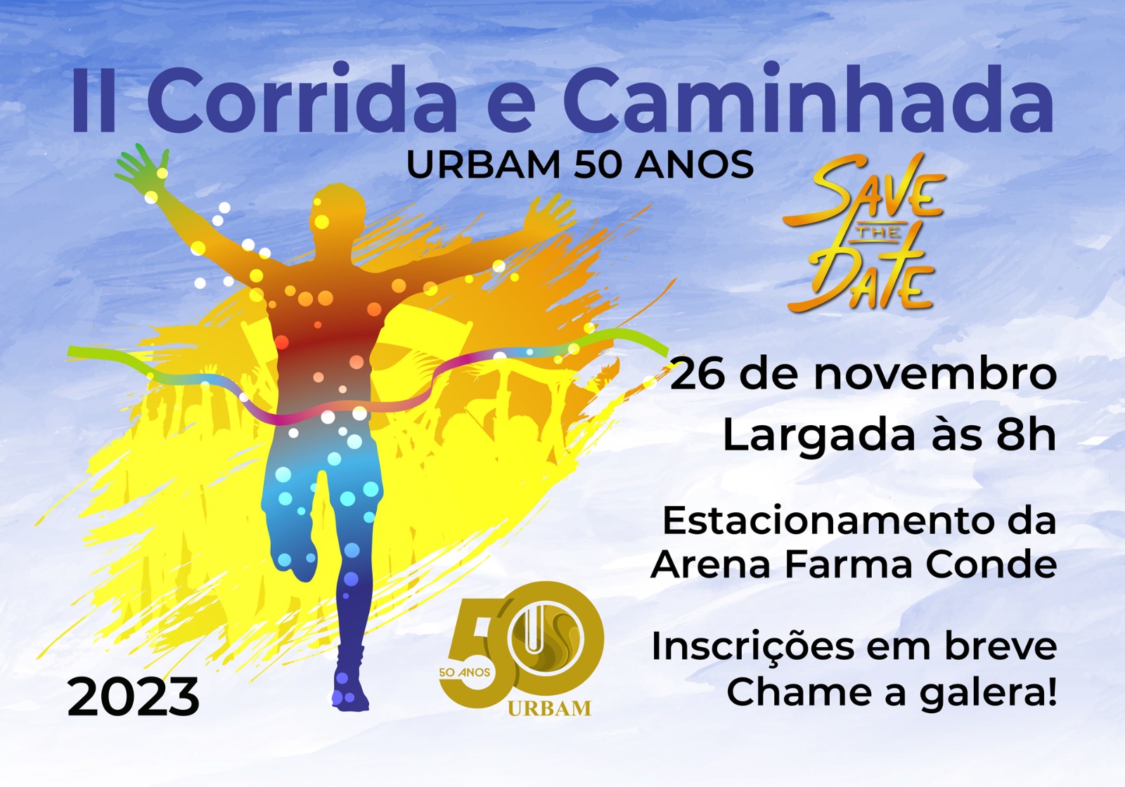Vem aí a II Corrida e Caminhada Urbam 50 anos. Os eventos serão realizados no estacionamento da Arena Farmaconde, no dia 26 de novembro, com largada às 8h.